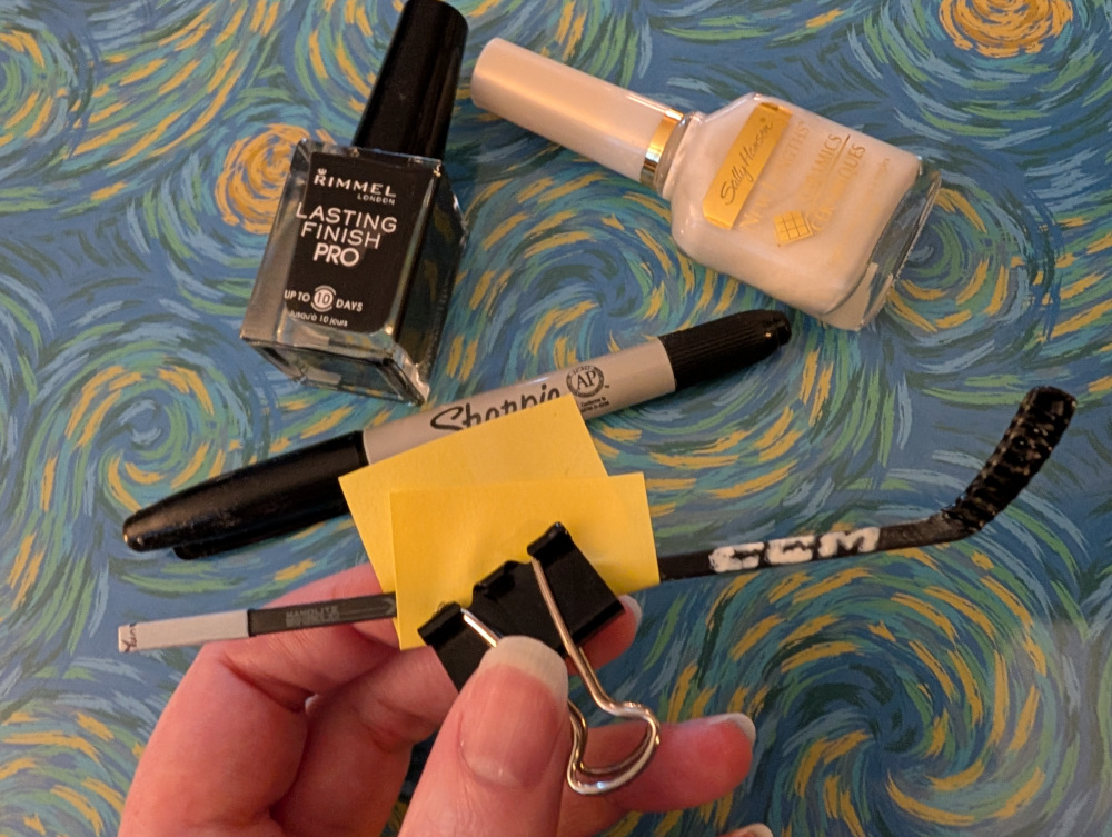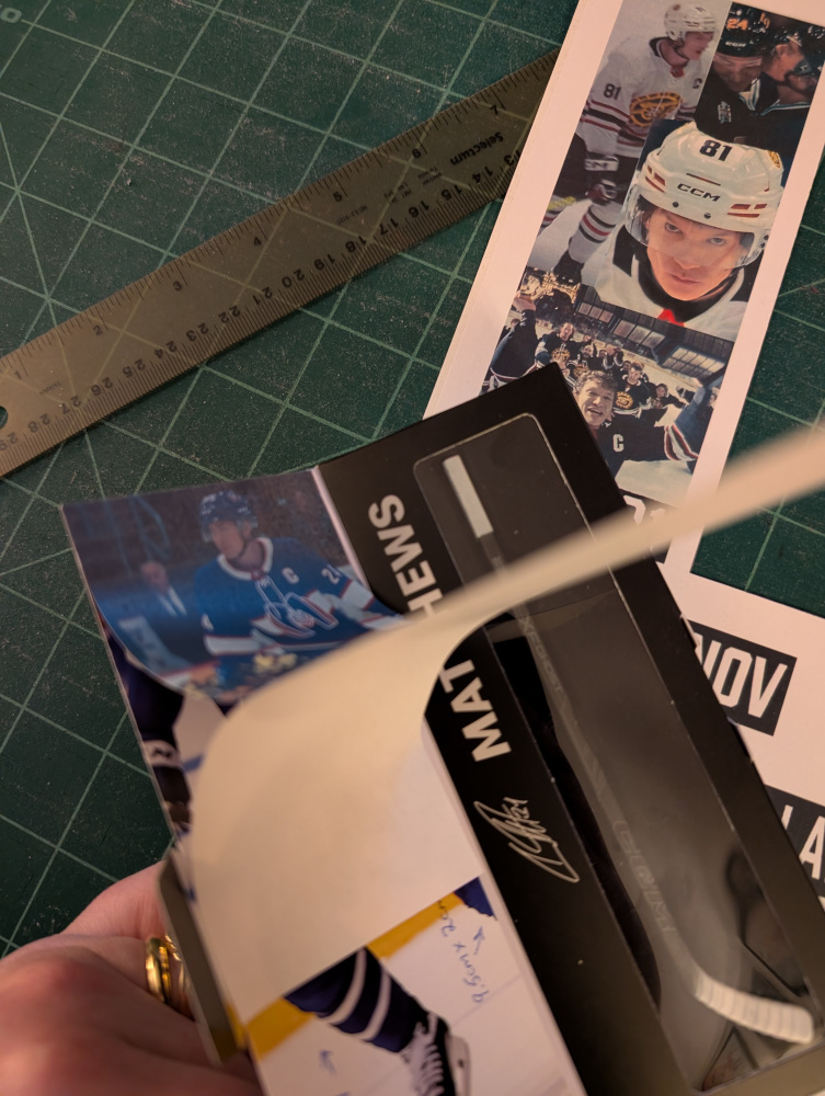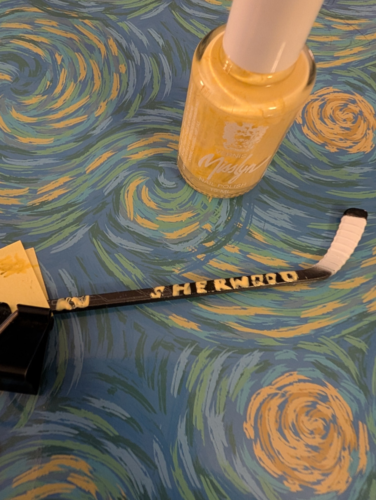 Just print out the PDF on sticker paper, cut it out, and stick it to your box. If you REALLY want to get fancy, you can paint the sticks to match the player’s. Note that Shane’s stick has his mom’s name at the top!