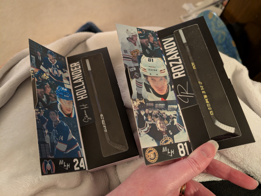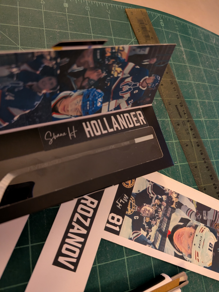 I’m not overly thrilled about the colour of yellow on Ilya’s stick, but highlighter didn’t work and I didn’t have a brighter nail polish. I used black, white, and yellow nail polish to redesign the sticks, and black fine sharpie to write Yuna’s name. The font for the character’s last name is grabbed from the jerseys up in the Heated Rivalry gift shop, as are the numbers. The logos for the teams are from the enamel pins in the same place. The MLH logo is from the video game (with Ilya’s “face on the cover of the fu€king game”). I removed the backgrounds in Photopea. The pictures are screen grabs. The signature is a font that I felt embodied the character, and I made the decision of how they would sign their names. Everything was dropped into Canva, and then I downloaded images that I made into a PDF to keep the size right.