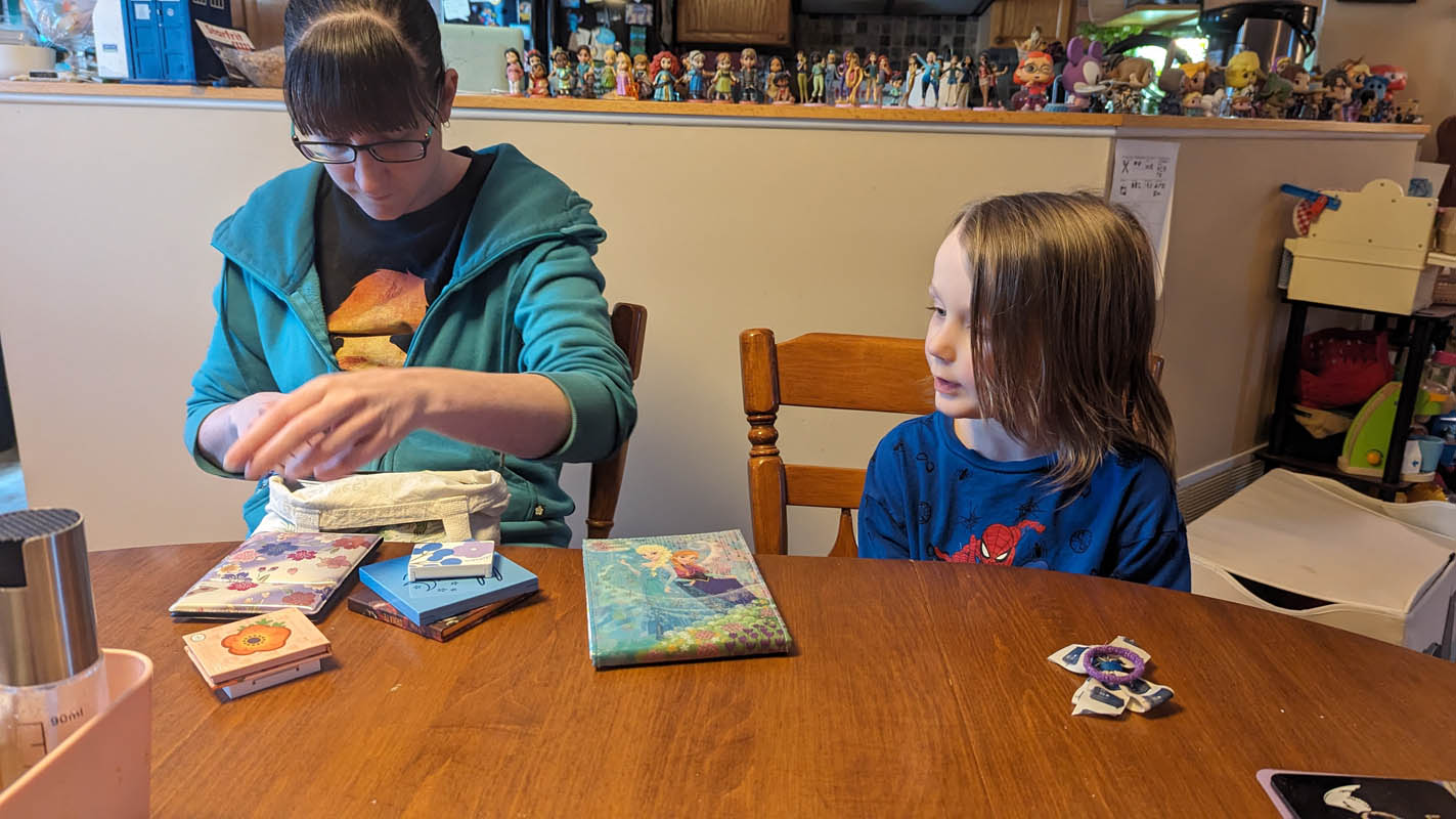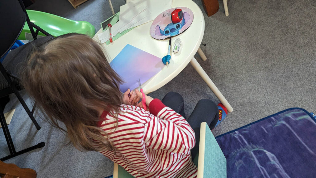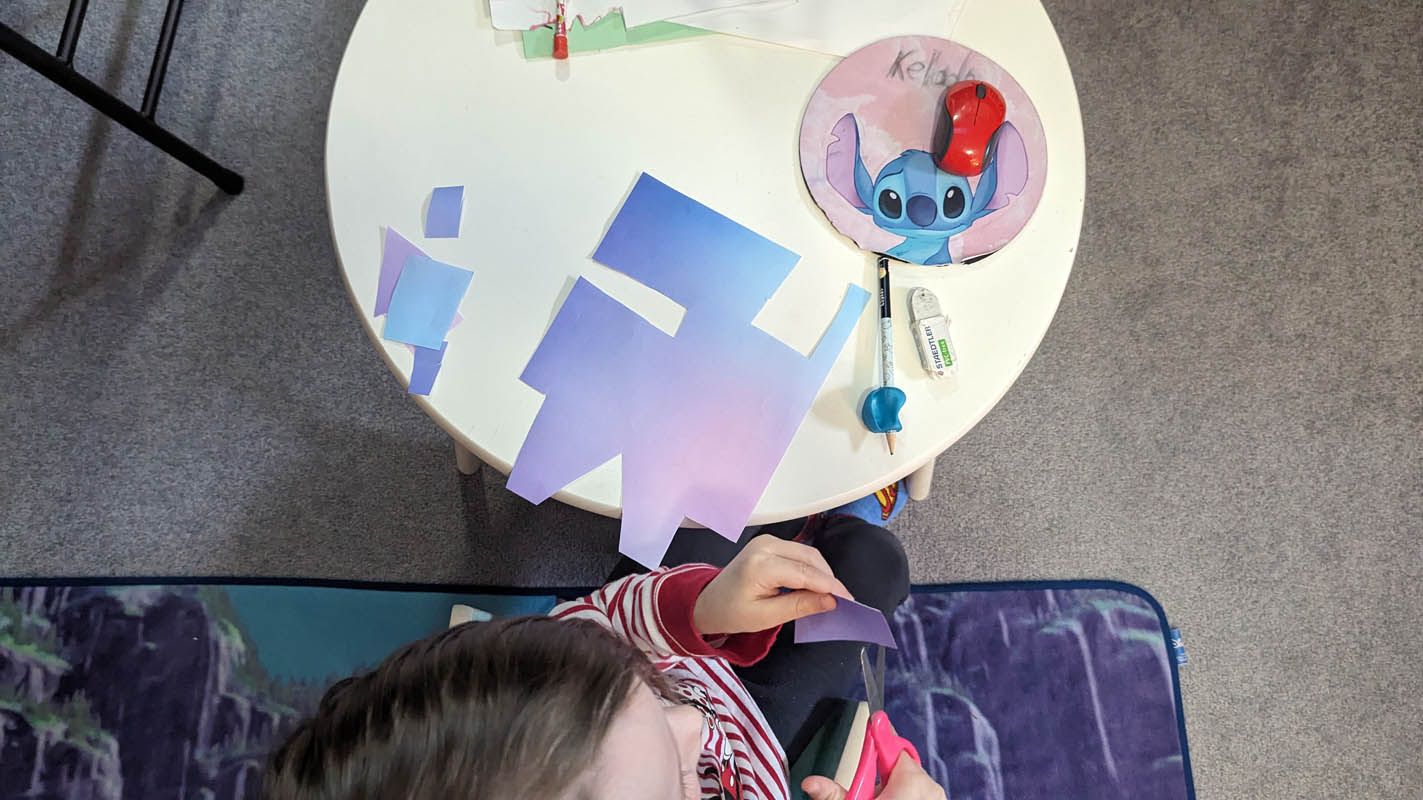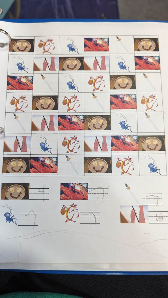 Write touch and feel book – This was still a monumental project. We started it on Monday, building the concept and starting on the first page (Joy). Tuesday, we completed Fear. Wednesday saw the completion of Disgust and Sadness, and Thursday was Anger. Friday was the cover. I explained how to measure and cut each page and guided him in that. He drew each picture for each page after designing them. Joy – playing with toys (a toy car on a play mat), Fear – ghosts (Slimer from Ghostbusters), Disgust – mushroom, Sadness – a mirror to show loneliness, Anger – not being allowed to play with his sister (a picture of himself behind a closed door). I used the xacto knife to cut out the holes in the paper to avoid cutting tiny fingers.
