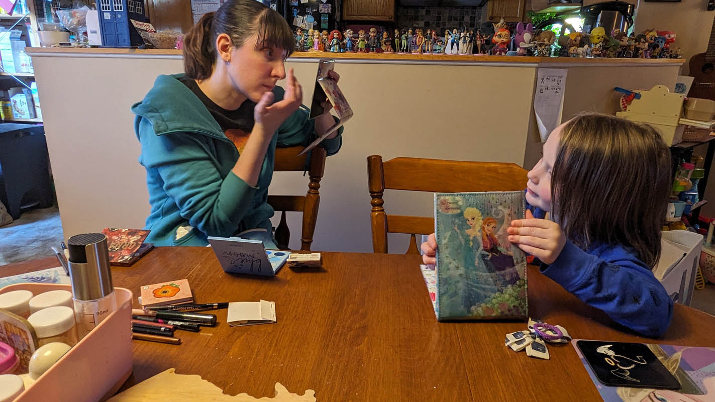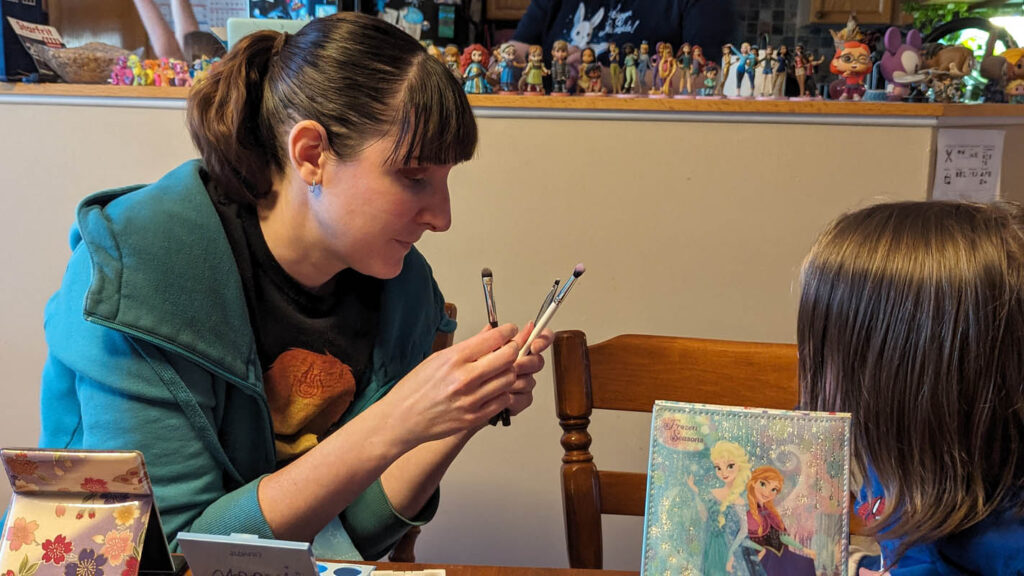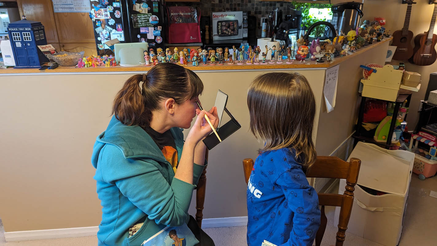 Learn about makeup – Pegasus decided he didn’t want to wear it (totally fine, obviously!) but since we had special guest Aunt Lindsay over, she put it on herself and talked about what she was doing and the two main rules of makeup: 1. Makeup is for fun and for yourself, and 2. Never share makeup brushes!