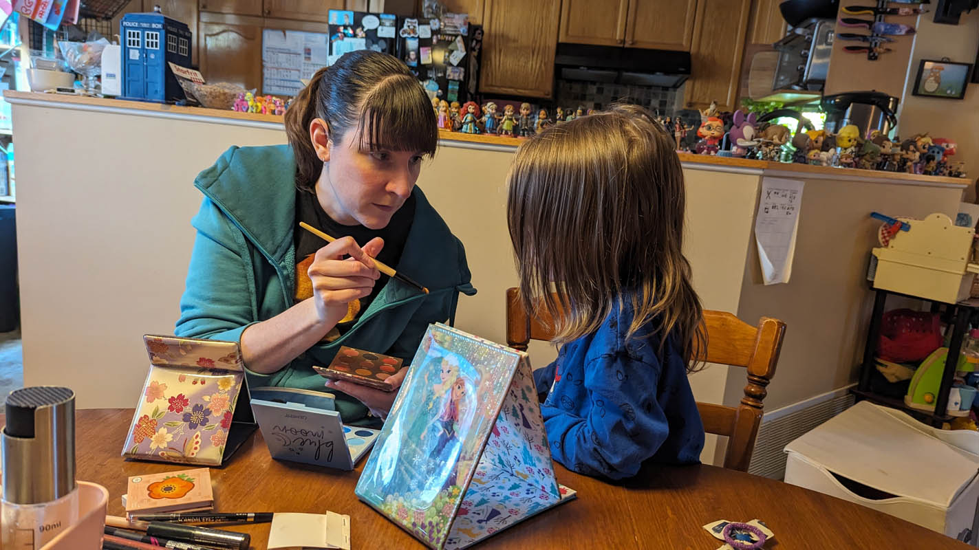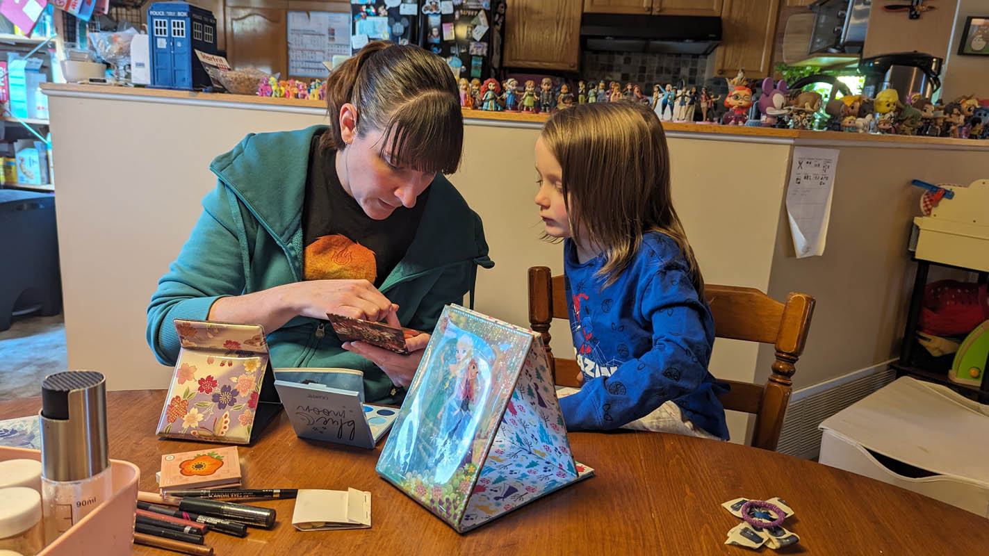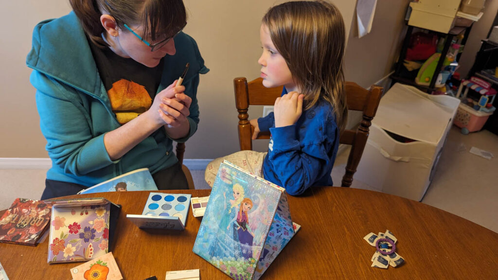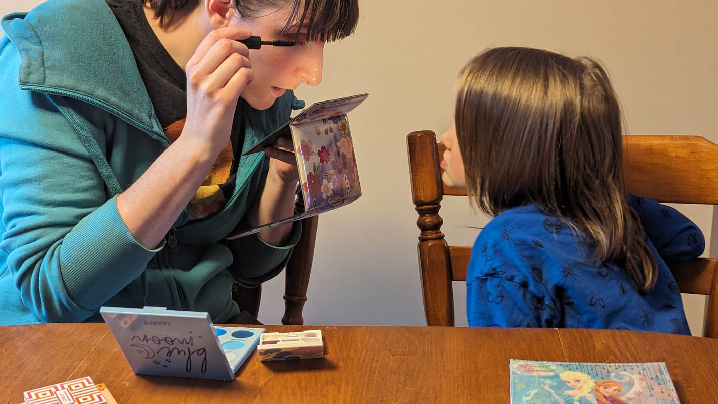 Learn about makeup – Pegasus decided he didn’t want to wear it (totally fine, obviously!) but since we had special guest Aunt Lindsay over, she put it on herself and talked about what she was doing and the two main rules of makeup: 1. Makeup is for fun and for yourself, and 2. Never share makeup brushes!