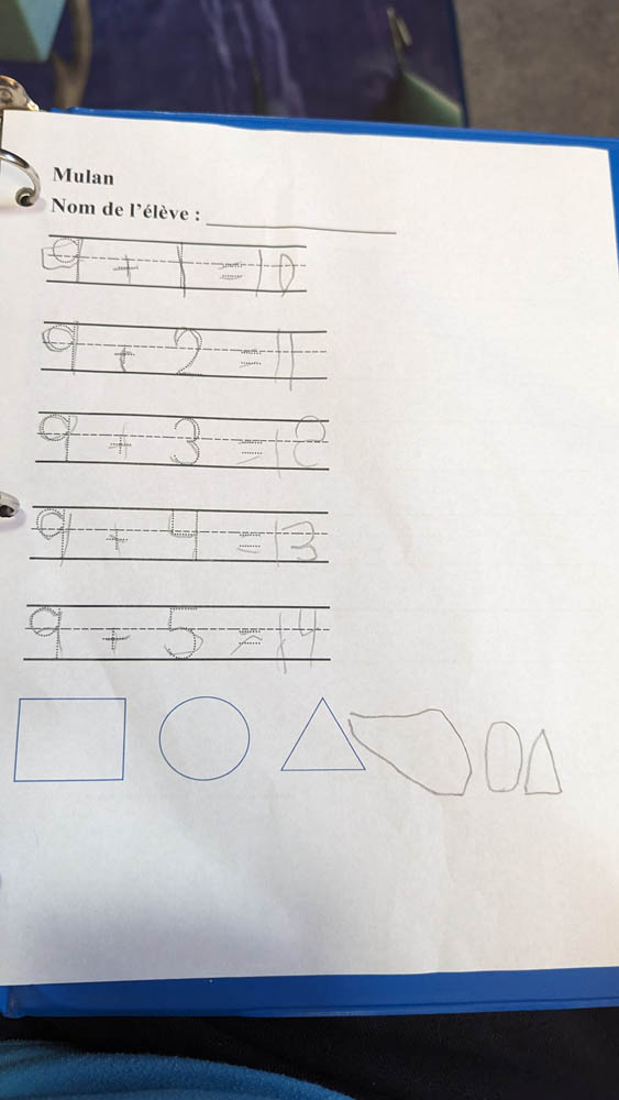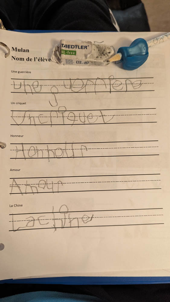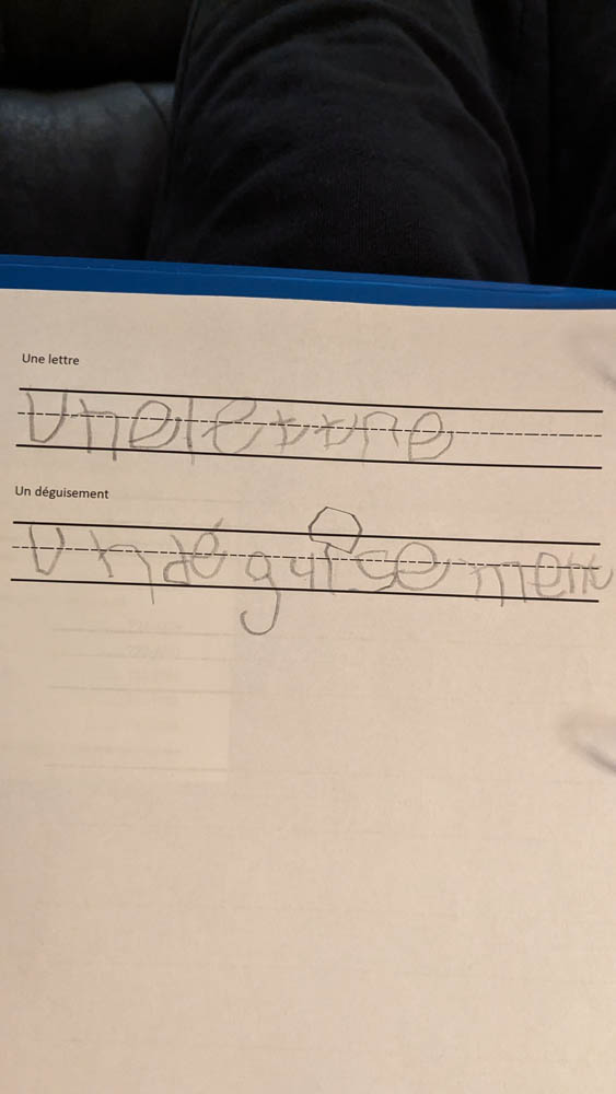 We’re working on spacing and keeping the words on the bottom line. The March break work that he did helped a little.