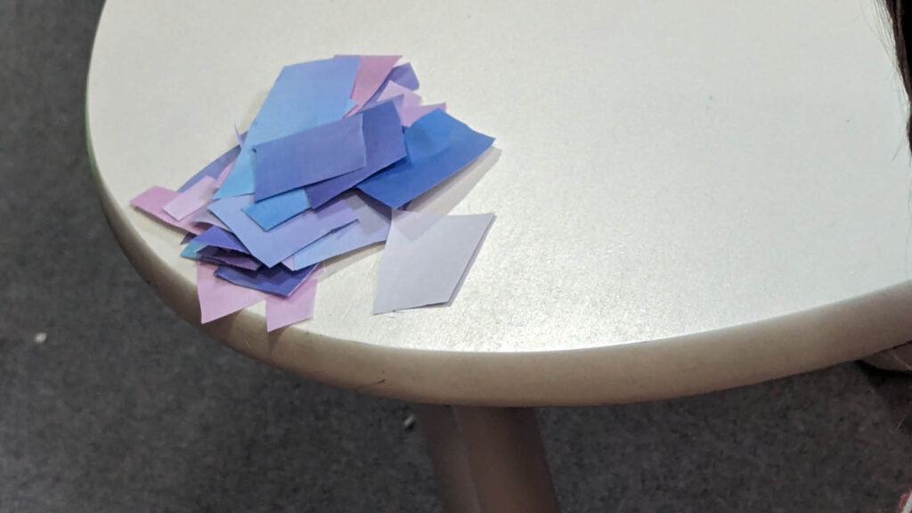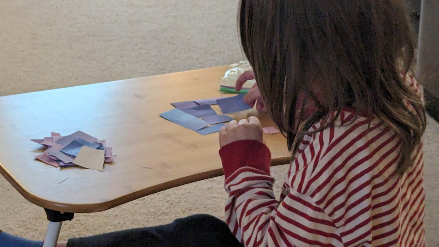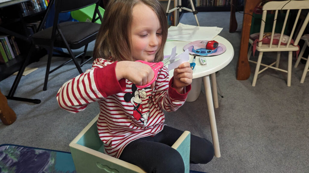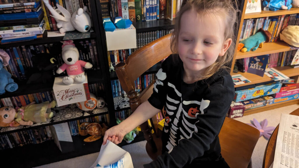 Make a puzzle – Instead of gluing the paper to foam, which didn’t really work last time and we didn’t have any foam this time, I just let Pegasus have fun cutting shapes into the paper. Wait, let me begin at the beginning. He had fun choosing pictures to put on the background he had chosen, and then when I explained that he was going to cut it up, he decided that he didn’t want pictures, he just wanted the background. Okay, now we’re caught up. He proceeded to cut literal shapes into the paper, which I found hilarious. And for the leftover paper, he cut it into tiny pieces because, and I quote, “I want it to be harder than Dragon’s.” Then he put it “together”. He said it was too hard and that he probably should have made the pieces bigger (no kidding, buddy). But he was very happy with the resulting “image”, which was not the original shape of the paper, I might add. He cleaned it up before I had the chance to take a picture of his creation.