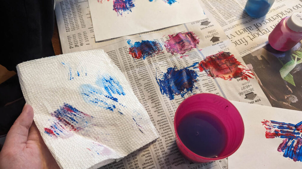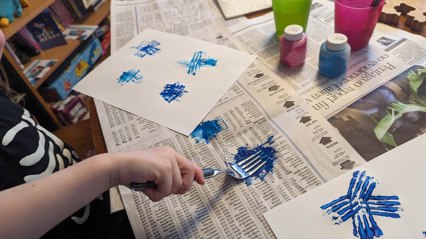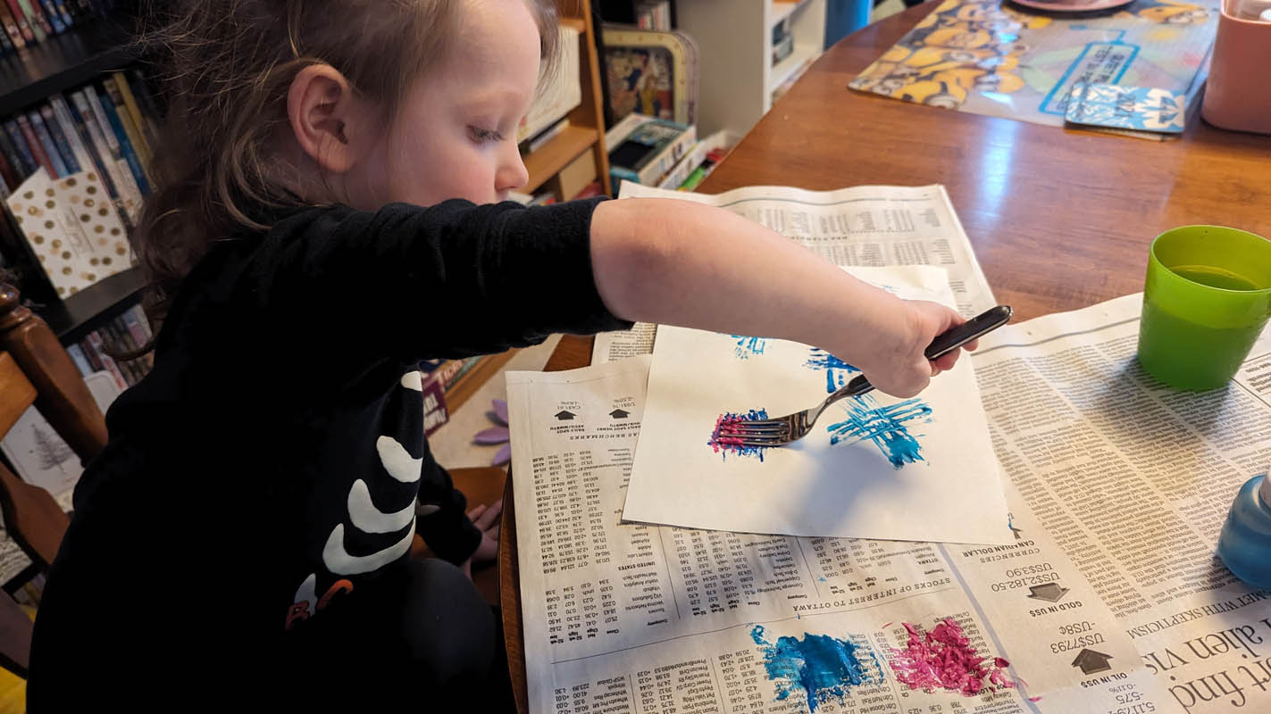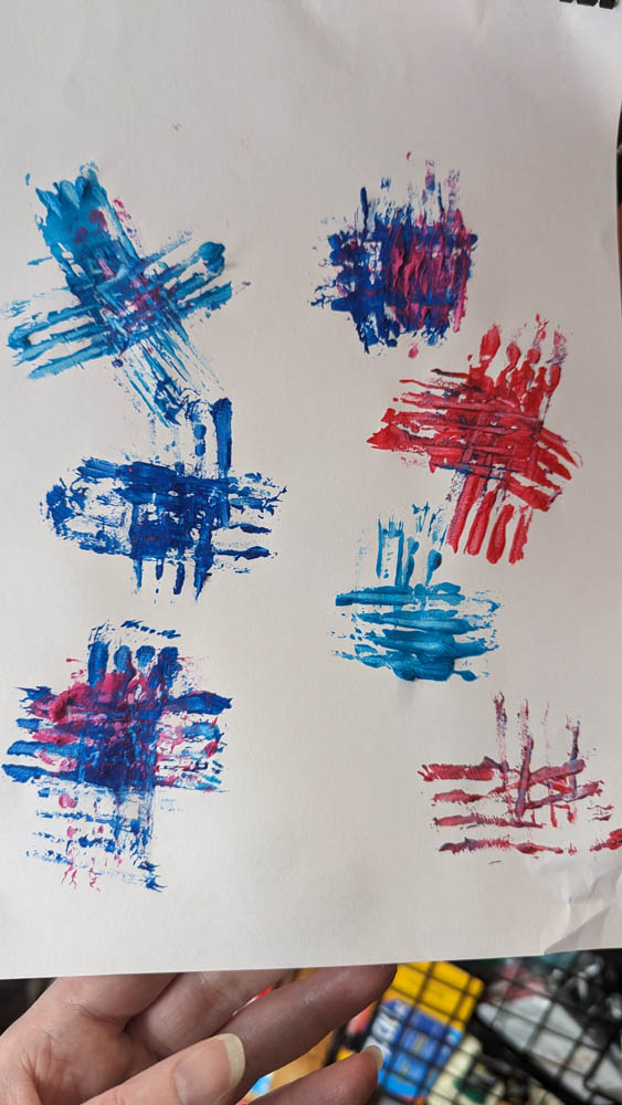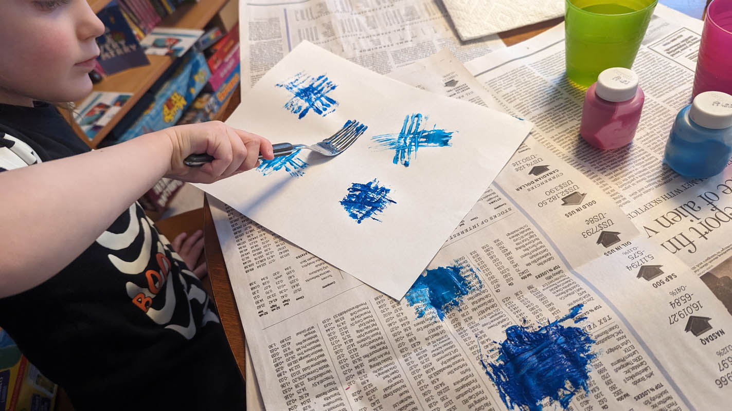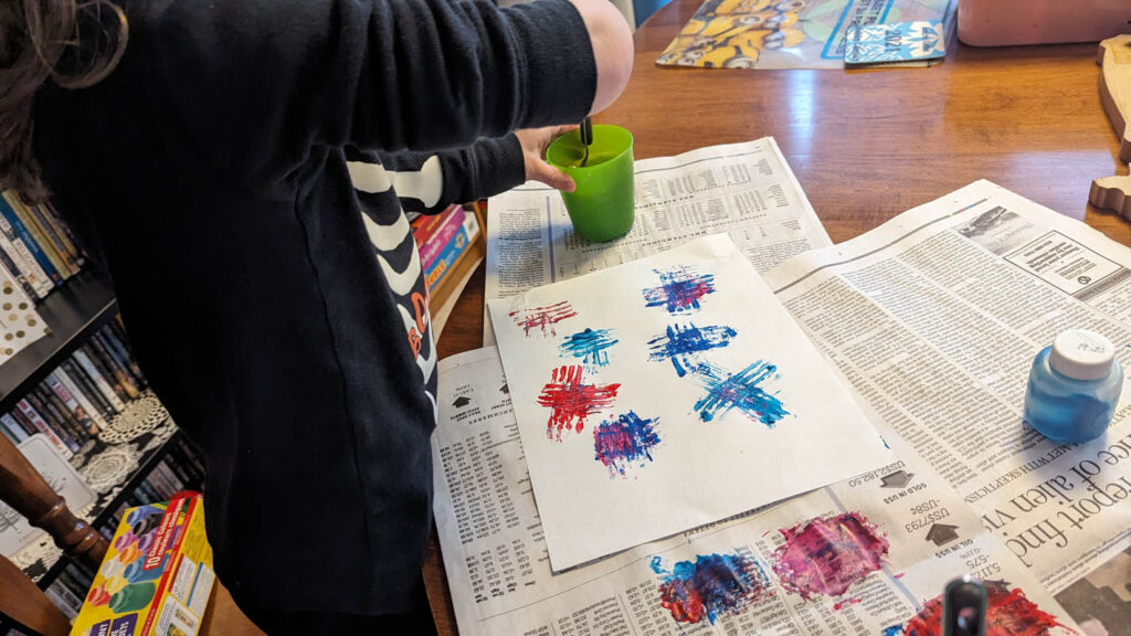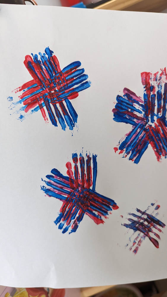 Fireworks with paint – I wasn’t sure what to expect with this one. Dragon had a major meltdown over it. But Pegasus had a lot of fun, I think partly because I used regular forks instead of plastic ones, so they worked really well. He insisted that I make fireworks with him, and I had fun with it as well. He chose both of our colours and I think it turned out very well.