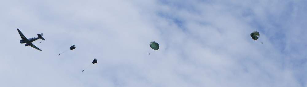 Every town is decorated in flags from England, France, the States, Germany, Poland, Canada, etc. The store windows are all painted with murals of paratroopers and flags and soldiers. And everyone is dressed up in either 1940s clothing or re-enactment military outfits. As you drive on the highway, you can be passed by WWII jeeps. They have organized dances with swing music, and fireworks displays. They have military camps set up with authentic gear, and parade displays of military vehicles. They have parachutes jumps in full WWII outfits, including the parachute, and from the original C47 planes! Everyone partakes in the celebrations – tourists and locals alike. Although tourists aren’t allowed to jump out of the planes…