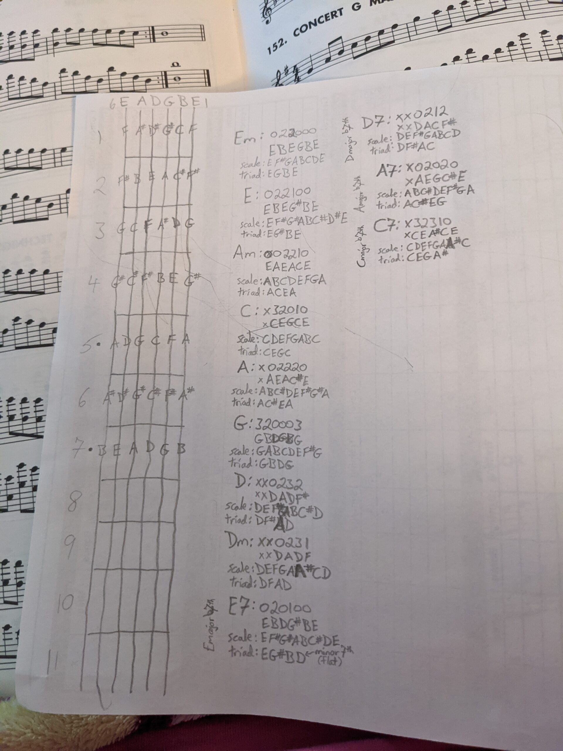 The next set of lessons is knowledge stuff. So I’m learning how to do scales! They’re starting off with a simple scales with no sharps or flats. They didn’t give it a name, but I start on an open E, so I guess it’s an E major?
