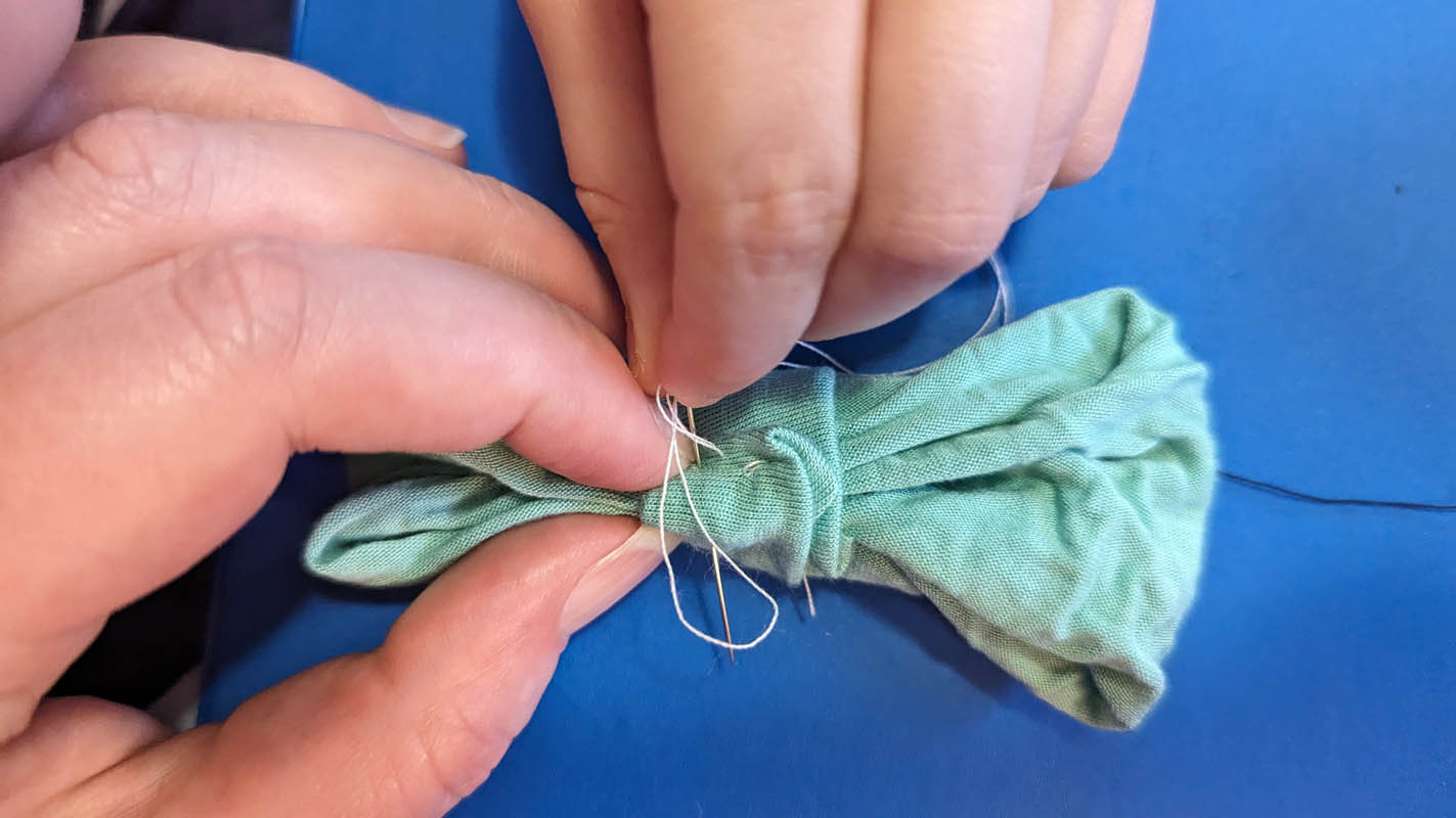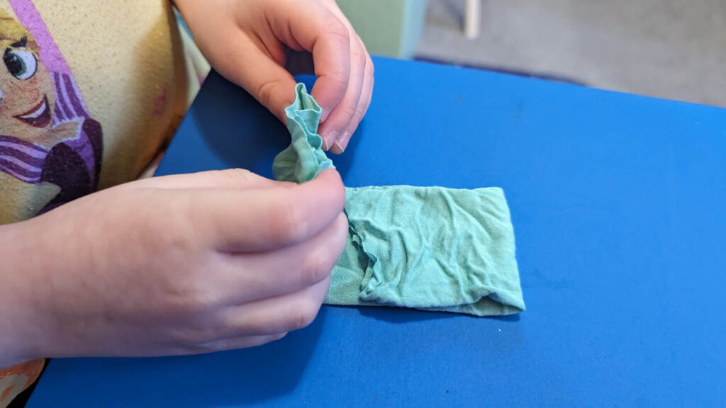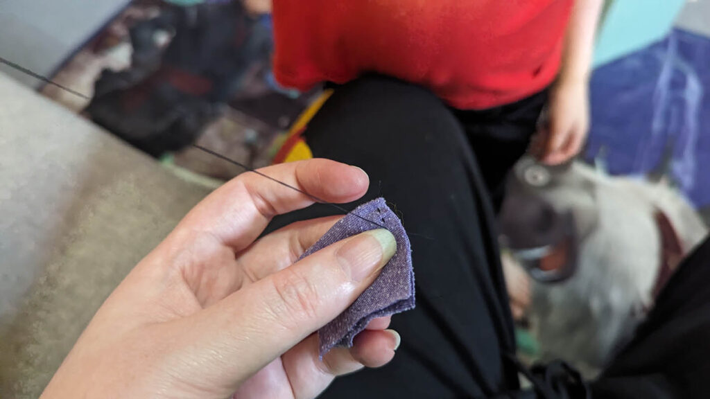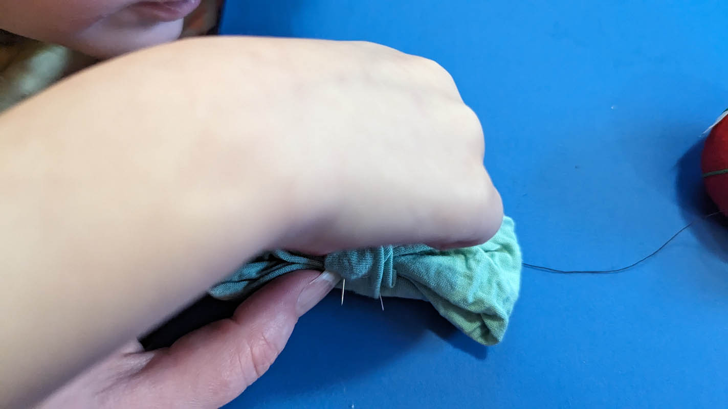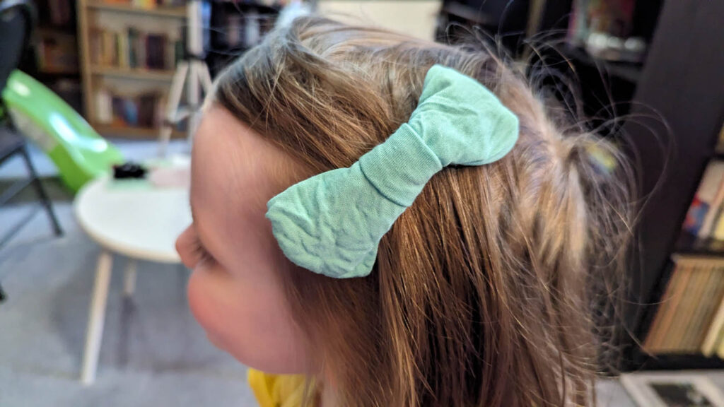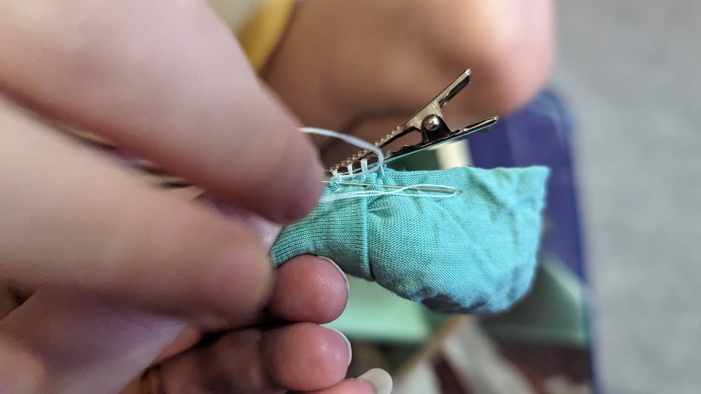 Make a hair clip – He chose this soft green fabric (which I had used to make my Vanelloppe cosplay in 2013). We didn’t glue it like the instructions said, but sewed it instead. I made the setting stiches, and he added more to secure it, and tied off the thread. He was very proud of himself.