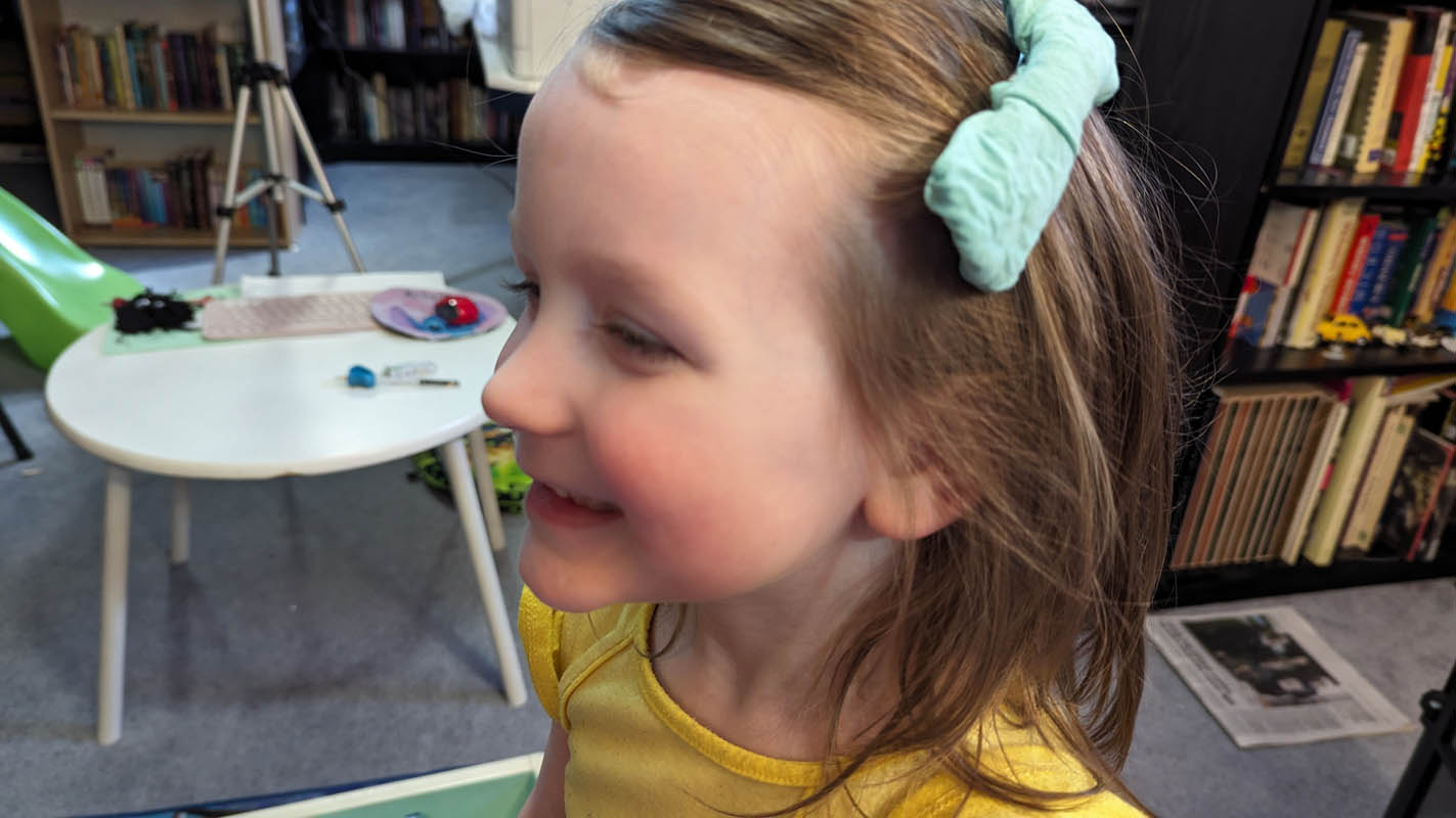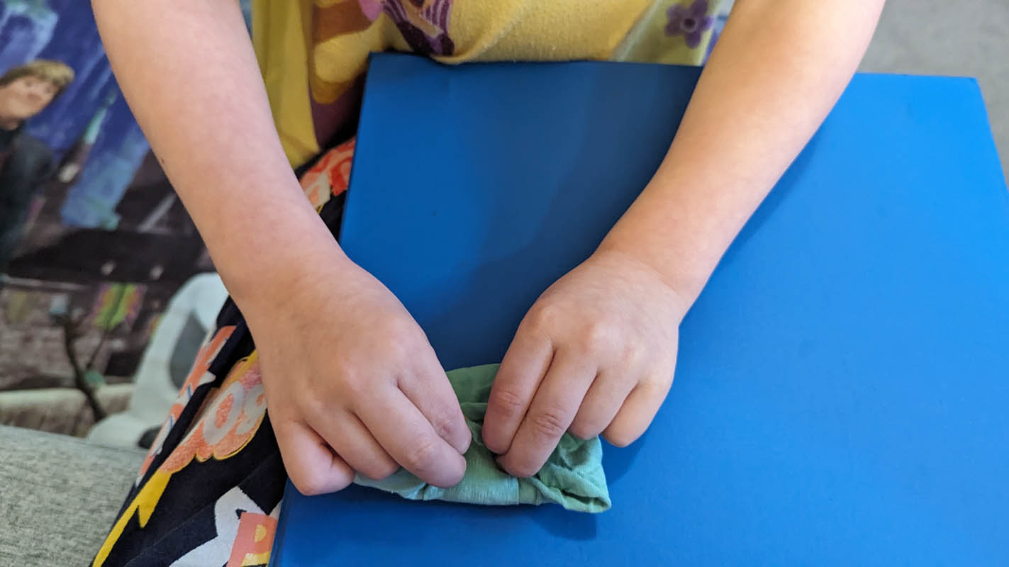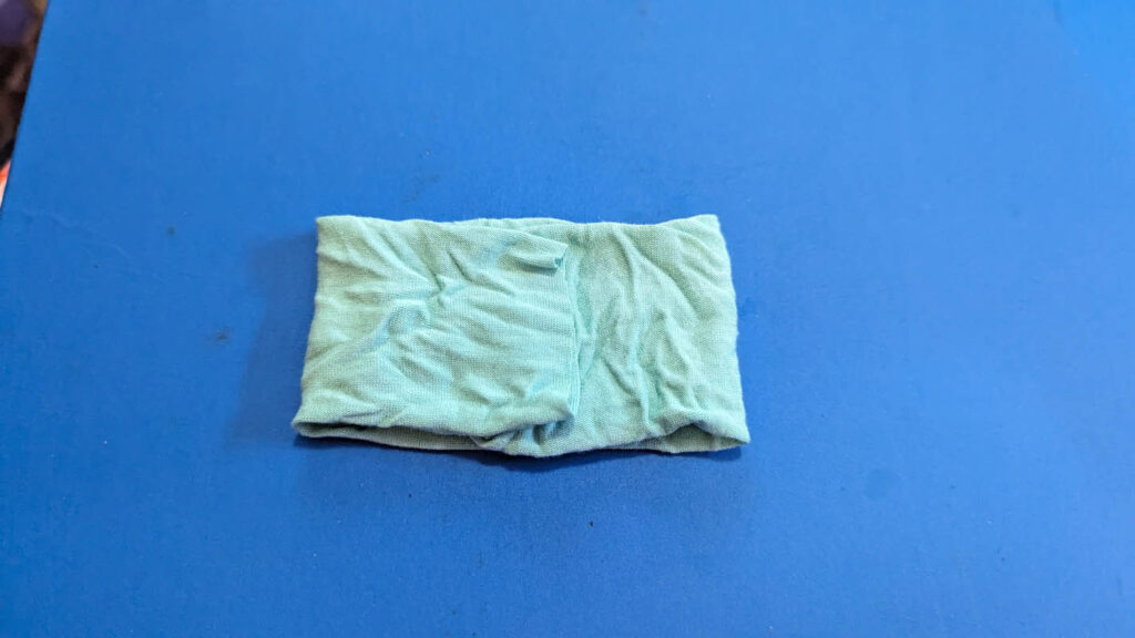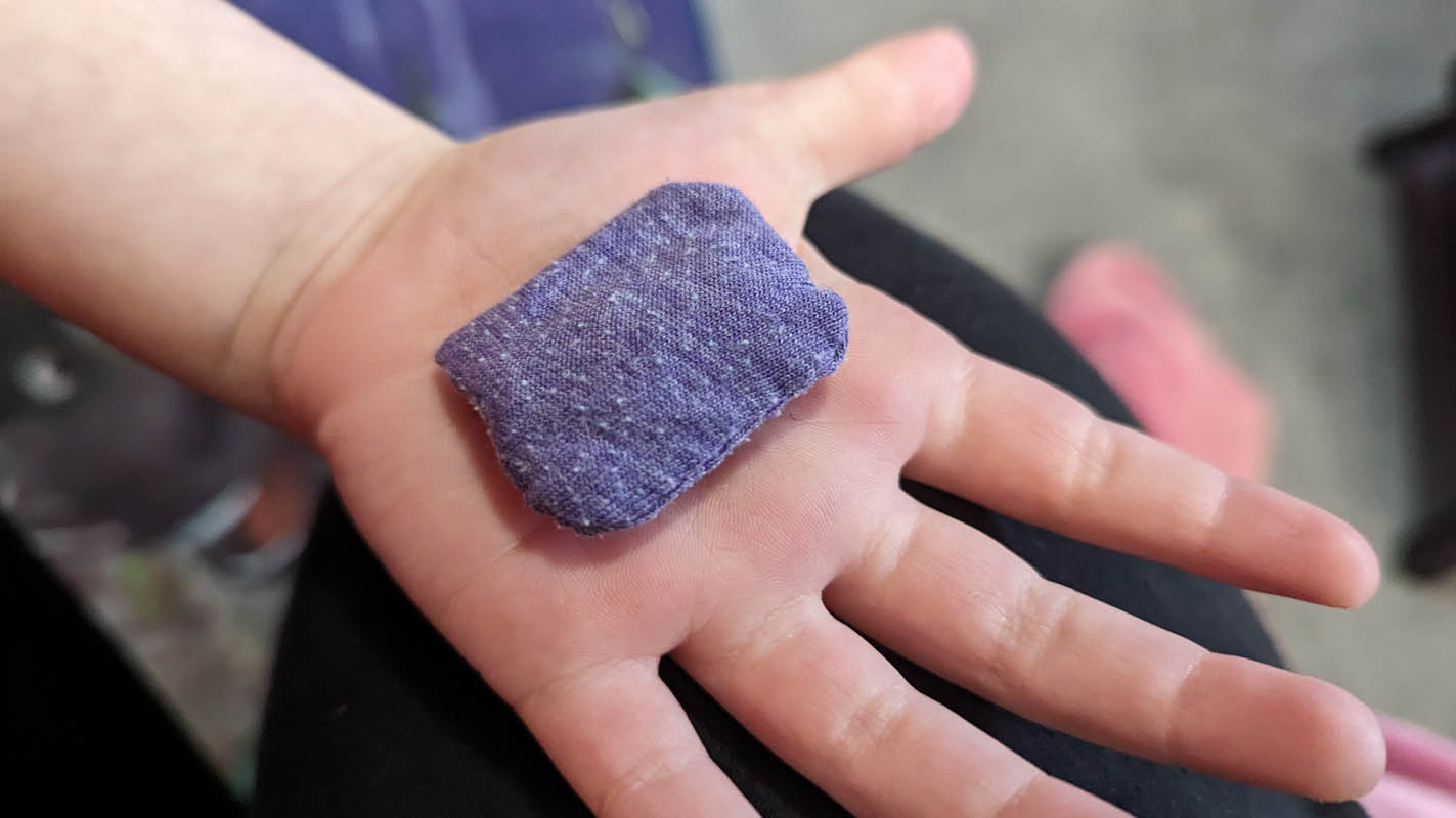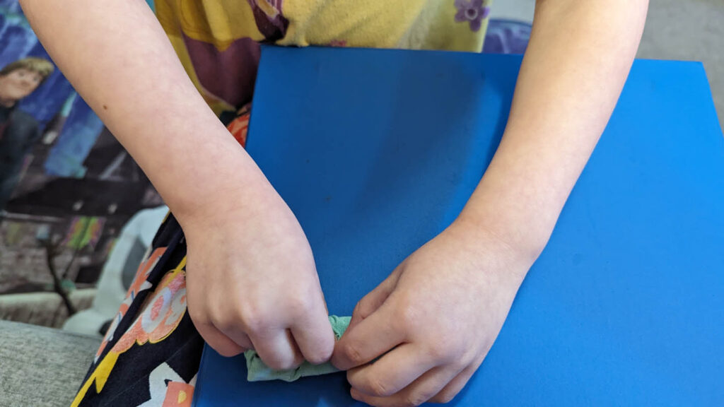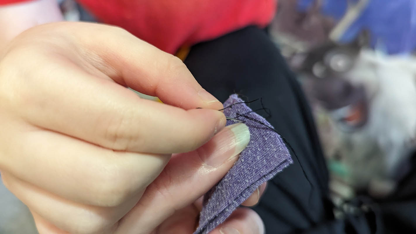 Make a hair clip – He chose this soft green fabric (which I had used to make my Vanelloppe cosplay in 2013). We didn’t glue it like the instructions said, but sewed it instead. I made the setting stiches, and he added more to secure it, and tied off the thread. He was very proud of himself.